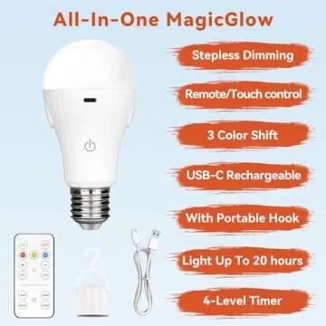 Show more Introducing the NEPORAL MagicGlow rechargeable light bulbs, designed to revolutionize your lighting experience! With an innovative 3 COLOR SHIFT feature, this versatile product allows you to switch between cool white, daylight, and warm white hues effortlessly. Whether you are setting the mood for a cozy evening or need bright illumination for a particular task, the stepless dimming function allows you to get just the right ambiance for every occasion.