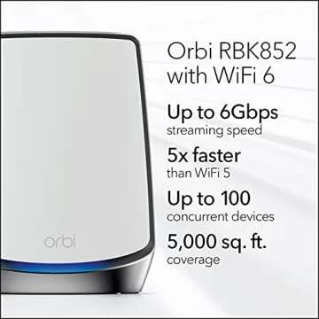... Show more Introducing the ultimate solution for seamless connectivity—the NETGEAR Orbi RBK852 Mesh WiFi 6 System. Designed for expansive spaces, this system spans up to 5,000 sq. ft and can support up to 100 devices, making it perfect for large homes and busy families. Whether you’re streaming HD movies, gaming online, or participating in web conferences, this router delivers ultrafast AX6000 gigabit speeds with WiFi 6 technology to ensure an uninterrupted experience.