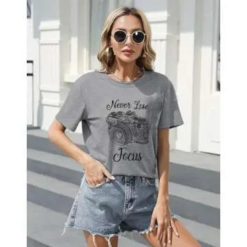 Never Lose Focus Shirt Women Camera Graphic Cute O-Neck Short Sleeve T-Shirt Top (Medium, Gray)