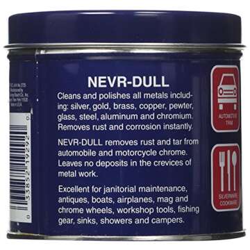 Show moreIntroducing the remarkable Nevr-Dull 5 oz Wadding Polish, the ultimate solution for polishing and cleaning all your cherished metals! With its non-toxic, safe formula, this versatile product works effortlessly on delicate surfaces, ensuring no scratches or damage occur during use. Manufactured in the United States, it's been a trusted choice for over 30 years, making it an essential addition to your home maintenance toolkit.