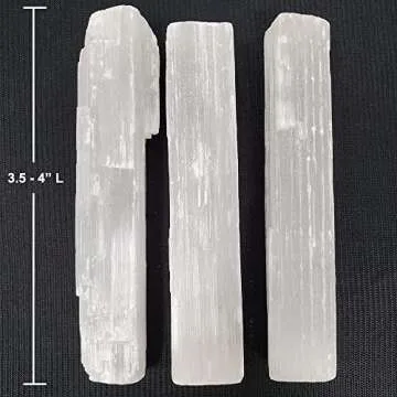 Show more Unveil the transformative energy of the remarkable Selenite Sticks! Handcrafted from the pristine mines of Morocco, each package comes with three sticks measuring 4 inches in length, perfect for a multitude of uses. Known as one of the most powerful stones in the metaphysical realm, Selenite excels at clearing energy blockages, promoting tranquility, and enhancing the flow of positive vibrations. Its unique properties make it ideal for meditation practices, cleansing rituals, and even as a stunning decorative piece in your home.