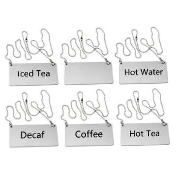 New Star Foodservice 27549 Stainless Steel Table Tent Chain Sign Combo, Includes (Coffee), (Decaf), (Hot Tea), (Iced Tea), (Hot Water), and (Blank), 3.5"x 1.5", Combo Set of 6