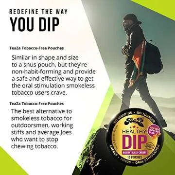 Show moreIntroducing the ultimate alternative to smokeless tobacco – Teaza Tobacco Free Chew Dip. This revolutionary product is not just a chew dip; it’s a bold flavor experience designed for those ready to redefine their relationship with tobacco. With its tantalizing black cherry flavor, each pouch delivers an intense explosion of tart, spicy, and sweet sensations that only true dip enthusiasts can appreciate. It’s engineered to satisfy cravings while providing an invigorating boost of energy thanks to added caffeine.