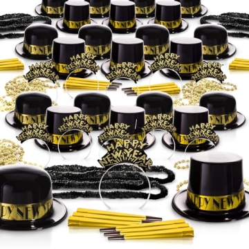 Show moreIntroducing the ultimate party essential for your New Year’s Eve celebration – the New Year’s Eve 2025 250-Piece Kit. Designed for festivities of all sizes, this remarkable kit provides everything you need to create a vibrant and coordinated atmosphere for up to 100 guests. With a carefully curated assortment of 50 Tiaras, 25 Top Hats, 25 Derby Hats, 100 Horns, 25 Bead Necklaces, and 25 Leis, it’s the perfect combination of elegance and excitement. The sleek black and gold color scheme elevates the thematic experience, making it a stunning addition to your party décor. Each item is crafted from durable, high-quality materials, ensuring your decorations withstand the night’s joyous celebrations. Say goodbye to flimsy party supplies and embrace a kit that provides value and longevity. Whether you’re hosting an extravagant gala or a cozy family gathering, this complete party set is the ultimate canvas for your New Year festivities. Celebrate with style and sophistication, and let your guests revel in the spirit of the occasion!