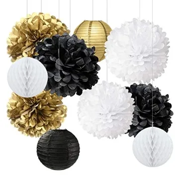 New Year’s Gold Black White Party Decorations Kit with Pom Poms and Lanterns