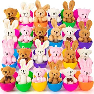 Show moreHop into the spirit of Easter with the NEWBEA 24 Pack Prefilled Easter Eggs featuring adorable stuffed bunny toys! These vibrant plastic eggs stand at a delightful 3.15 inches and come in six bright colors, making them eye-catching additions to any Easter celebration. Forget the traditional candy; surprise the little ones instead with a plush bunny hidden inside each egg! These charming toys are designed not only to bring joy and excitement to Easter egg hunts but also serve as wonderful gifts and keepsakes that kids will adore. Perfectly sized to fit in Easter baskets, classrooms, or as fun prizes, these eggs are an exciting alternative that encourages imaginative play.