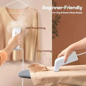 Show more The Newbealer 2in1 Steamer and Dry Iron is your ultimate solution for wrinkle-free clothing, specially designed for beginners who seek simplicity without compromising on functionality. This innovative gadget combines the convenience of a handheld steamer with the effectiveness of a traditional dry iron, allowing you to switch between both modes effortlessly. With a powerful steam output that reaches up to 284°F and a quick heat-up time of just 25 seconds, you can quickly restore your garments to pristine condition. The compact and portable design makes it a travel companion you can't do without, easily fitting into your suitcase while still possessing the capacity to handle up to 170ml of water, ensuring longer steaming sessions without interruptions.