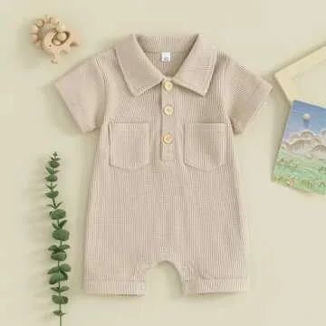 Newborn Baby Boy Clothes Waffle Knit Polo Romper Bodysuit Solid Short Sleeve Collared Onesie One Piece Jumpsuit (A-Khaki, 0-3 Months)