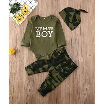 Newborn Baby Girl Clothes Mommy Sayings Top Printed Bodysuits Camouflage Pants+Hats Romper Outfit Set (Mama's boy, 6-9 Months)