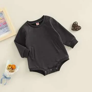 Newborn Infant Baby Boy Girl Basic Plain Pocket Long Sleeve Romper Bodysuit Tops Solid Fall Outfit Clothes (Black Gray, 6-12 Months)