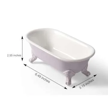 Show more Elevate your home decor with the stunning NEWHENGS 6.5" Ceramic Mini Decorative Clawfoot Bathtub Bar Soap Dish. This exquisite piece draws inspiration from vintage claw-foot bath designs, offering a unique blend of style and functionality. Its distressed white finish, beautifully complemented by charming two-tone colors, makes it a delightful addition that fits seamlessly into any bathroom or kitchen setting. Measuring at a convenient size of 6.5x3.15x2.44 inches, it is designed to hold a standard bar of soap securely, allowing you to enjoy both practicality and aesthetic appeal in one luxurious package.