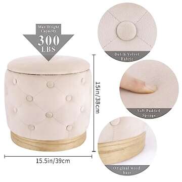 NEWIMAGE Round Storage Ottoman Dutch Velvet Pouf Ottoman 15''H Ottoman with Storage Luxury Round Stool for Living Room Bedroom Balcony Dressing Snack(Cream)