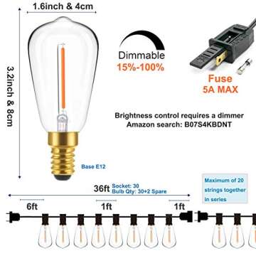Show moreTransform your space and create a cozy atmosphere with the Newpow Outdoor String Lights. Measuring an impressive 36ft, these lights come equipped with 30 LED filament bulbs, plus 2 spare bulbs, all designed to mimic the warm glow of traditional Edison-style bulbs at a soothing 2200K. Whether you're planning an outdoor soirée, decorating your backyard, or enhancing your restaurant's ambiance, these string lights combine durability with vintage charm to elevate any environment.
