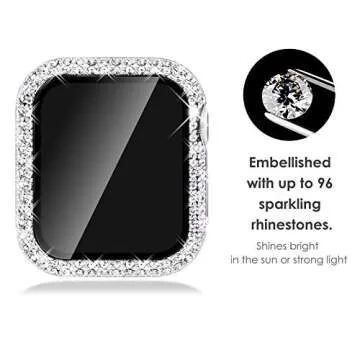 Show more Introducing the NewWays 2-Pack Bling Compatible for Apple Watch Cases, a stunning way to elevate your style while keeping your valuable device protected. Designed specifically for your 40mm SE 2022 Series 6, 5, and 4 Apple Watch, this set includes two elegant cases in silver and clear that beautifully embellish your watch with 96 premium quality rhinestones. These eye-catching embellishments shine brilliantly in sunlight, making your wrist the center of attention during any occasion.