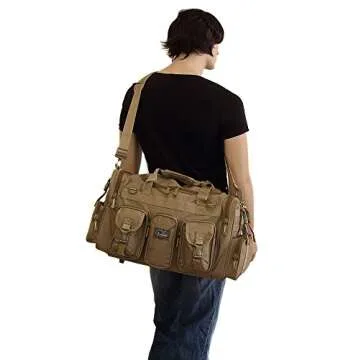 Show moreIntroducing the Nexpak Mens Large 22" Inch Tan Duffel Duffle Military Molle Tactical Gear Shoulder Strap Travel Bag, the ultimate companion for outdoor enthusiasts and adventure seekers alike! This rugged yet stylish duffel bag boasts an impressive capacity of 2600 cu. in., making it the perfect carry-on companion or day bag for every occasion. With dimensions of 22” width x 12” height x 10” depth, it provides more than enough room to fit all your essentials, whether you're headed to the range, taking a short trip, or simply out for a day full of activities.