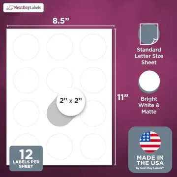 Introducing the NextDayLabels – 2 Inch Round Labels for Bleeds, the ultimate solution for all your labeling needs! Designed with versatility in mind, these 2-inch diameter circle labels come in sheets of 12, with a total of 300 labels per package, providing you with ample supply for projects ranging from crafting to inventory management. Whether you're labeling products, decorating items, or creating custom stickers, these matte white labels deliver outstanding performance...