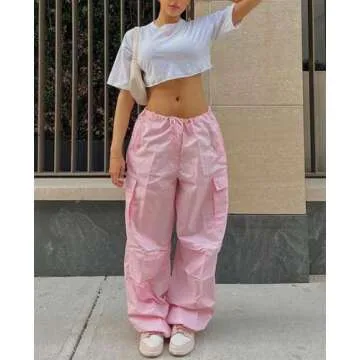 Neyaolk Parachute Pants for Women, Cargo Pants Women Baggy, Drawstring Low Waist Baggy Jogger Relaxed Y2K Pants Pink M