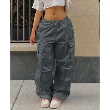 Neyaolk Women's Baggy Cargo Pants with Pocket Drawstring Low Waist Loose Hip Hop Casual Trousers Sweatpant Y2K Streetwear Grey S
