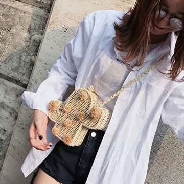 NIBD Beach Bag Cactus Straw Bag Summer Bags with Pom Pom Women Messenger Handbag Braided New Rattan Bag, Beige, 7.5"*7.5"*2.4"