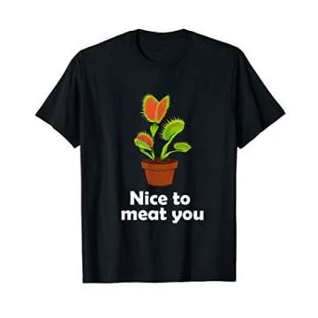 Show moreIntroducing the ultimate conversation starter for plant enthusiasts and gardening aficionados: the Nice To Meat You Carnivorous Plant for Venus Fly Trap Gift T-Shirt. This uniquely designed tee showcases an eye-catching graphic of a Venus flytrap, complete with the sassy slogan "Bite Me" that perfectly reflects the quirky nature of this fascinating carnivorous plant. Made from lightweight fabric, this classic fit t-shirt ensures comfort during long hours spent in the garden or out on the town. Whether you’re shopping for a special green-thumbed friend or treating yourself to something fun, this t-shirt promises to delight all lovers of flora and fauna.