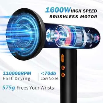 Nicebay Ionic Hair Dryer with Diffuser, Professional Blow Dryer with 3 Attachments, 110000RPM High-Speed Brushless Motor for Fast Drying, Lightweight, Low Noise, 1600W