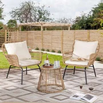 Show more Introducing the exquisite Boho Bistro Set – a stunning combination of style, comfort, and durability that will enhance any outdoor space. Crafted with premium materials, this set includes two wide, oversized armchairs and a chic side table, providing a perfect nook for relaxation or social gatherings.