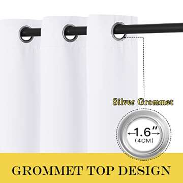 Show moreTransform your living space with the NICETOWN Room Darkening White Curtain, an elegant and functional solution for any home. Designed with a focus on aesthetic appeal, each curtain panel boasts a stunning matte silver grommet finish, effortlessly blending with your existing decor. Measuring a generous 66" wide x 84" long, these curtains are perfect for creating a captivating ambiance while enhancing privacy. The innovative triple weave technology ensures that you enjoy a bright white color without the fear of impurities, making these curtains a smart choice for any modern interior.