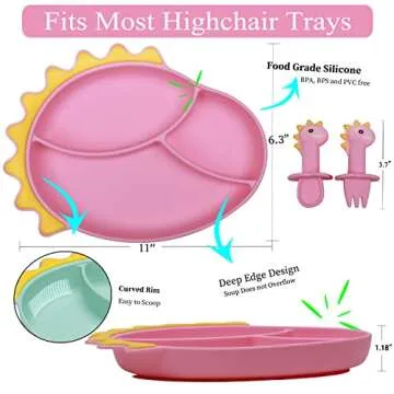 NICINGU Suction Plates for Baby,Silicone Toddler Plates with Spoon Fork set Divided Dinosaurs Plates Self Feeding Training Baby Dinner Plate-Pink Dinosaurs Plate Set
