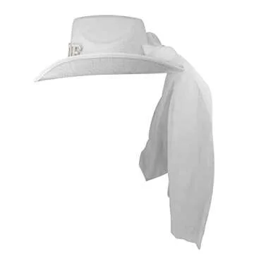 Show more Introducing the ultimate Western Cowgirl Hat for the modern bride! This unique hat features a stunning attached veil adorned with the word BRIDE made from faux pearls and silver gems. Choose between elegant black or classic white to match any bridal theme and accentuate the joy of the day. The hat is not just a fashion statement; it transforms the wedding experience into a memorable moment, ensuring the woman or man of the hour feels truly special.