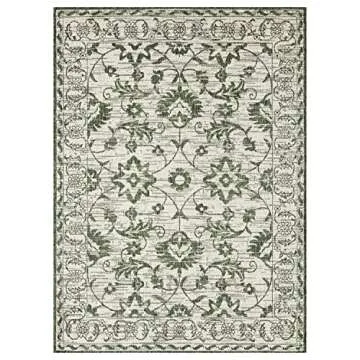 Show more Transform your space with the exquisite Nicole Miller New York Patio Country Ayala Botanical Floral Indoor/Outdoor Area Rug, designed to enhance both indoor and outdoor environments. Featuring a stunning damask floral design complemented by a decorative border, this rug exemplifies elegance while providing practicality. Crafted with utmost precision, it serves as a versatile solution for various areas of your home, from sunny patios to cozy living rooms. The soothing light green and ivory hues create a serene ambiance, seamlessly blending with your existing decor.