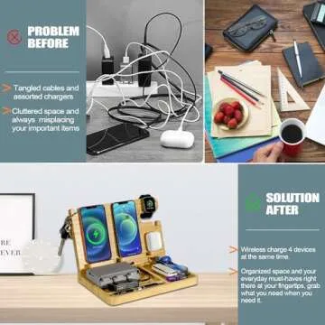 Introducing the Nightstand Charging Station, an innovative and stylish solution designed to streamline your charging routine while keeping your personal belongings tidy and organized. Crafted from premium bamboo wood, this 27W Fast Charging Wireless Charger Stand is compatible with multiple devices including iPhones, Apple Watches, AirPods, and Samsung products. With its unique built-in functionality, this charging dock allows you to charge up to four devices simultaneously...