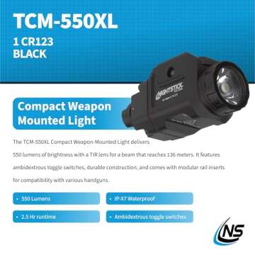 Show moreIntroducing the Nightstick TCM-550XL Compact Rail-Mounted Tactical Light, a powerful companion for your tactical needs! This exceptional flashlight utilizes high-powered LED technology, delivering an impressive 550 lumens with a remarkable 4,612 candela output. It features a precision-focused beam that reaches up to 136 meters, ensuring that you can illuminate your target with clarity and precision. Built for reliability and performance, this flashlight is essential for police, first responders, and anyone requiring a dependable light source.