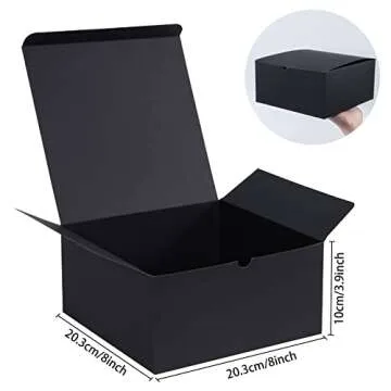 ... Show more Introducing the perfect solution for all your gifting needs! This set of 10 stylish black gift boxes measures 8x8x4 inches, making them an ideal size for a variety of gifting occasions. Whether it's for packaging homemade soaps, inviting cookies, or any other thoughtful creation, these paper gift boxes are your go-to choice. Crafted from high-quality 400 gsm thick cardboard, they boast durability and stability, ensuring your gifts remain secure and beautifully presented.