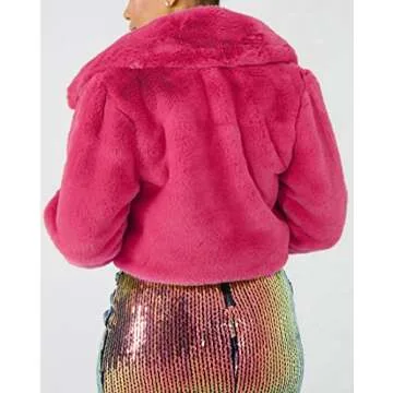 Nihsatin Womens Hot Pink Faux Fur Cropped Coat Long Sleeve Lapel Shaggy Jacket Fur Outwear Coat Warm Winter