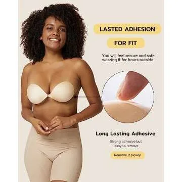 Show more Discover the delightful comfort of the Niidor Strapless Bra, an innovative solution for women seeking elegance and support without the fuss of traditional bras. Constructed from 100% safe materials, this bra boasts a skin-friendly silicone adhesive that ensures a secure fit, keeping you confident all day long. Unlike typical strapless options, this adhesive wonder is easy to wear and remove, allowing you to transition effortlessly from day to night without discomfort.