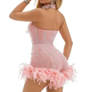 NIKBK Title Women's Glitter Birthday Party Dress,Halter/Off Shoulder Mesh Sleeveless Bodycon Mini Cocktail Dress,Sequin Romper, Beaded and Feathered Night Clubwear