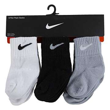 Show moreExperience unparalleled comfort and style for your little ones with the Nike Baby Ankle Gripper Socks! This set includes six pairs of mid-cut quarter socks designed specifically for infants aged 6 to 12 months. Crafted from soft knit fabric, these socks provide a cozy feel against delicate skin, ensuring that your baby stays comfortable all day long. The classic color scheme of white, black, and grey offers versatile styling options, making them the perfect addition to any outfit.