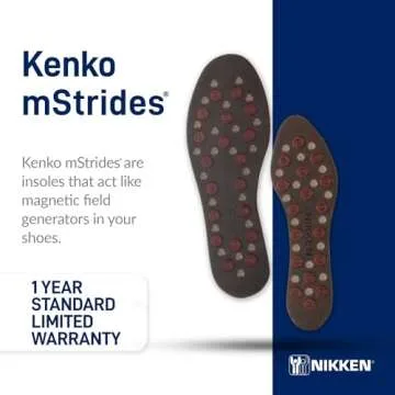 Show moreExperience a transformative journey with the Nikken Kenko mStrides Insoles, designed to revolutionize your walking experience. These innovative insoles leverage magnetic technology to generate a dynamic energy flow, enhancing your vitality with each step you take. Crafted for men’s shoe sizes 7-12, the insoles come with a convenient cut-to-fit design, ensuring a perfect fit for everyone. Ideal for individuals weighing up to 275 pounds, the mStrides prioritize your comfort and well-being, making long walks feel lighter and more invigorating, every step of the way.