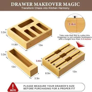 Show more Transform your chaotic kitchen into an organized haven with our innovative plastic wrap dispenser with cutter and baggie organizer. Say goodbye to the frustration of tangled storage bags and stuck drawers with this all-in-one solution that combines style and functionality. Expertly crafted from 100% natural bamboo, this product not only adds a warm, inviting touch to your kitchen but is also an eco-friendly alternative to plastic. Its sturdy design ensures longevity, withstanding daily use while keeping everything in place.
