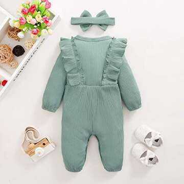 Show moreThe nilikastta Baby Girls Clothes Newborn Infant Ruffle Long Sleeve Romper Jumpsuit is the ultimate outfit for your little princess! Crafted from a soft, breathable, and stretchy fabric, this romper ensures maximum comfort against your baby's delicate skin. Designed to be skin-friendly, it allows for movement and flexibility, making it perfect for nap times, playdates, or those adorable photo moments. Featuring ruffled shoulders and an elastic waist with a cute bowknot headband, this outfit seamlessly combines functionality with adorable style. Plus, the snap-on closure simplifies diaper changes, ensuring that dressing your baby is a hassle-free experience. Available in charming light green, this ensemble is truly an eye-catcher!