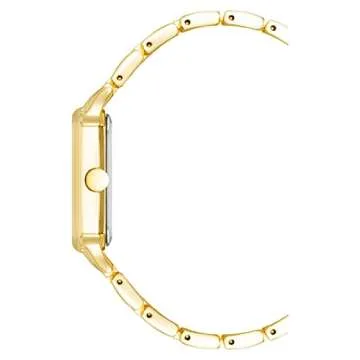 Show moreThe Nine West Women's Bracelet Watch is an exquisite blend of elegance and sophistication, designed for the modern woman who appreciates timeless fashion. Crafted with a durable mineral crystal lens, this watch features a stunning light champagne sunray dial adorned with radiant gold-tone hands and markers that ensure easy readability while adding a touch of luxury to your wrist. The elegant gold-tone adjustable link bracelet not only provides a comfortable fit but also boosts your ensemble’s chic factor. The secure fold-over clasp with double push-button safety guarantees that your beautiful timepiece remains securely adorned on your wrist throughout the day.