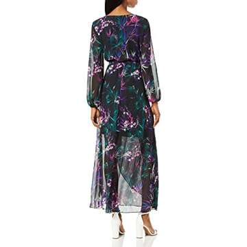 Nine West Women's Long Sleeve Faux Wrap Maxi, Black/Flamenco Multi, 4
