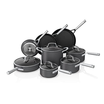 This sturdy and elegant 13-piece set, featuring hard-anodized exteriors, is not only built to last but also looks fantastic in any kitchen. Each pot and pan is engineered with ergonomically-designed stainless steel handles, ensuring comfort and control while cooking. The tempered glass lids provide a practical solution to monitor your food without compromising heat, which is essential for achieving glorious results. With 30% more aluminum compared to competitors, the heavy-gauge aluminum base delivers rapid heating and optimal cooking conditions.