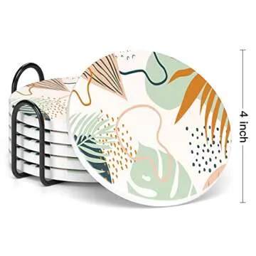 Nipichsha Coasters for Drinks, Set of 6 Cute Absorbent Ceramic Drink Coasters for Cup with Holder and Cork Base, Kitchen Home Decor Housewarming Gift, Round 4 in, Boho Leaves