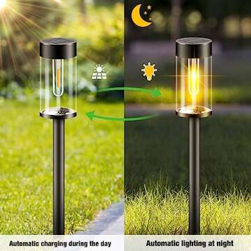 Show moreTransform your outdoor spaces with the stunning nipify LED Solar Pathway Lights Outdoor. This elegant lighting decoration features upgraded LED filament bulbs housed within a fully transparent lampshade, creating a pleasant 3000K warm white soft glow that beautifully complements any garden, lawn, or walkway. Whether you are hosting guests or simply enjoying a quiet evening, these lights not only enhance the visual appeal of your setting but also ensure safe navigation throughout your outdoor environment.