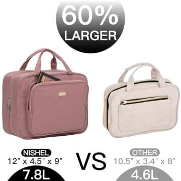 NISHEL Travel Toiletry Bag for Women Large Capacity, Makeup Essentials Organizer, Hanging Case for Accessories, Cosmetics, Rosewood-Pink