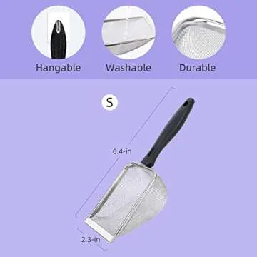 Show more Introducing the ultimate cleaning solution for small animal enthusiasts: the Niteangel Stainless Steel Hamster Mesh Scoop. Crafted from durable stainless steel, this fine sand scoop is designed to simplify the tedious task of cleaning your pet's terrarium or sand bath. With its ergonomic handle, you can comfortably hold the scoop while efficiently removing waste and debris. The thoughtful design features dense, small holes that allow you to effortlessly filter out wet and sticky particles without leaving behind any annoying mess.