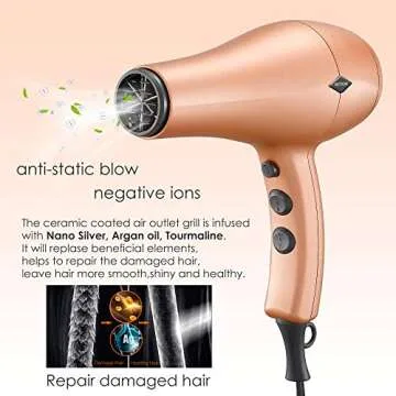 Show more Introducing the NITION Ceramic Hair Dryer, a revolutionary beauty tool designed to elevate your hair drying experience. This exceptional hair dryer combines innovative technology with user-friendly features, ensuring that you can achieve salon-quality results from the comfort of your own home. The ceramic-coated air outlet grill is not just for efficiency; it’s infused with nano silver, argan oil, and tourmaline, to leave your hair feeling smooth, shiny, and most importantly, healthy. The advanced formula helps combat static and frizz, making it a perfect choice for all hair types.