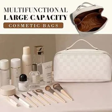 Niumike Large Capacity Travel Cosmetic Bags for Women - PU Leather Small Cute Plaid Checkered Makeup Bag Organizer Waterproof Portable Travel Toiletry Bag (White)