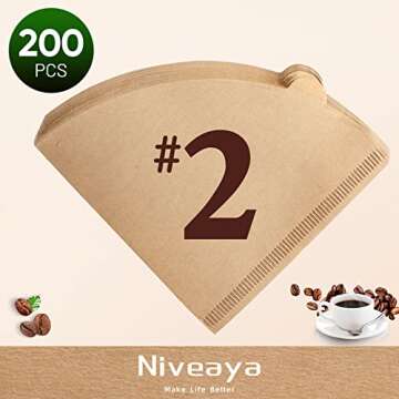Show more Experience the rich aroma of freshly brewed coffee with the Niveaya 200 Count Coffee Filters. Each pack contains an ample 200 pieces of size 02 filters, specially designed to meet all your coffee brewing needs, whether at home, in the office, or when you're entertaining guests. Crafted from food-grade natural wood pulp, these disposable filters ensure that your daily cup of joe is free from harmful chemicals, making every sip a delightful health-conscious choice.